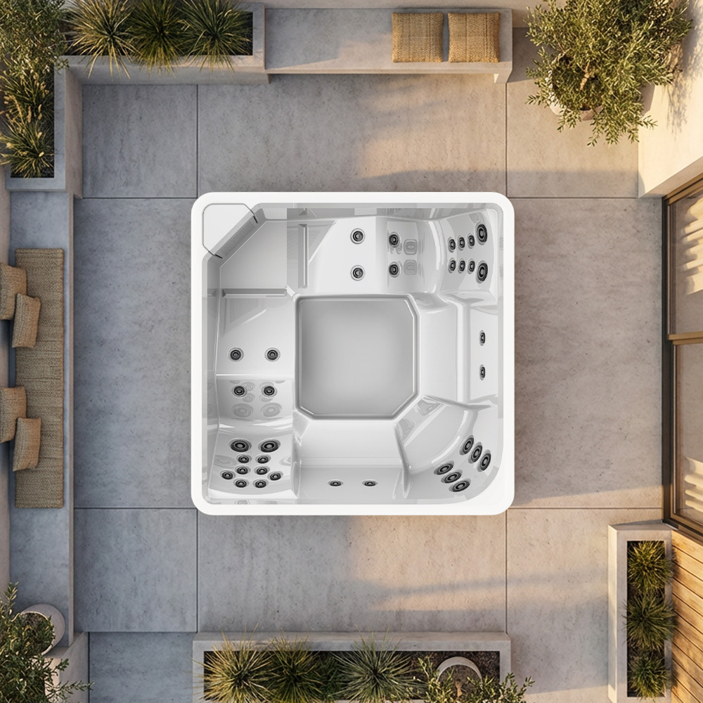 Novitek L-2 on suur ja elegantne õuevann, mis ühendab avaruse ja isikliku mugavuse. 230 × 230 cm mõõt loob tõelise spaakeskkonna, kus iga kasutaja saab nautida oma ruumi ja tasakaalustatud massaaži.